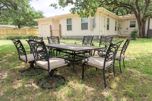 The real highlight of this home is the huge, fenced backyard, offering plenty of space for outdoor fun and relaxation. Enjoy meals and drinks on the comfortable outdoor seating or challenge your friends to a friendly game in the spacious yard. A grill is ready for your next BBQ, so you can enjoy a classic Texas cookout while soaking in the fresh air. Whether you're hosting a pre-game tailgate or simply relaxing after a day of exploring College Station, this backyard is the perfect place to unwind.
